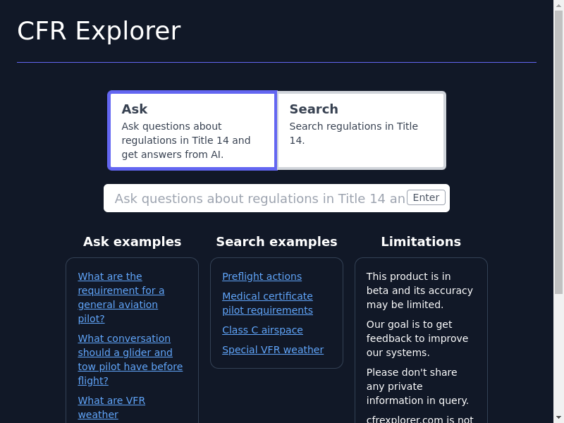 CFR Explorer是一个让用户向人工智能提问14个法规条例的网站。用户可以通过输入问题并得到AI提供的答案来获得有关法规的信息。该网站旨在提供关于Title 14规则的答案,例如通用航空飞行员的要求、滑翔机与拖船飞行前应进行的会话、在C类空域内VFR天气的要求等等。用户在搜索时可以参考已有的示例,例如预飞行行动、医疗证书飞行员要求、C类空域、特殊VFR天气等。在使用此产品时需要注意,它仍处于测试阶段,其准确性可能有限。网站旨在获得反馈来改善系统,所以不要在查询中分享任何私人信息。CFR Explorer由Zohaib开发,该网站还有一个Twitter账户。