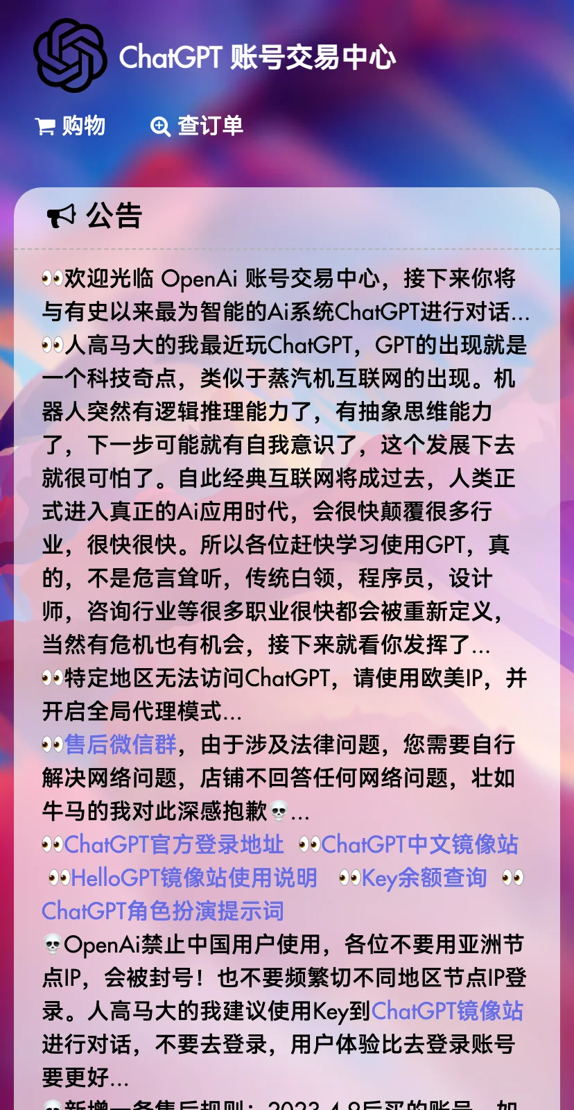 介绍: Pay.aaa.st是一个ChatGPT账户交易中心的网站,旨在为用户提供ChatGPT账号购买、售卖及在线交易服务。ChatGPT是一款智能的AI系统,可以进行多轮对话,具有逻辑推理和抽象思维的能力。使用者应开启全局代理模式并使用欧美IP,以确保可以正常访问该网站及相关服务。网站上提供了多种有用的链接,包括ChatGPT官方地址、角色扮演提示词以及账户余额查询等选项。同时,售后服务微信群也提供了相关帮助信息。该网站的开发意在说明ChatGPT的智能程度和应用潜力,预示着AI时代的到来与传统职业重新定义的挑战与机遇。总之,Pay.aaa.st是一个值得关注的网站,对于ChatGPT爱好者和对AI技术有兴趣的人来说,是一个必访的网站。