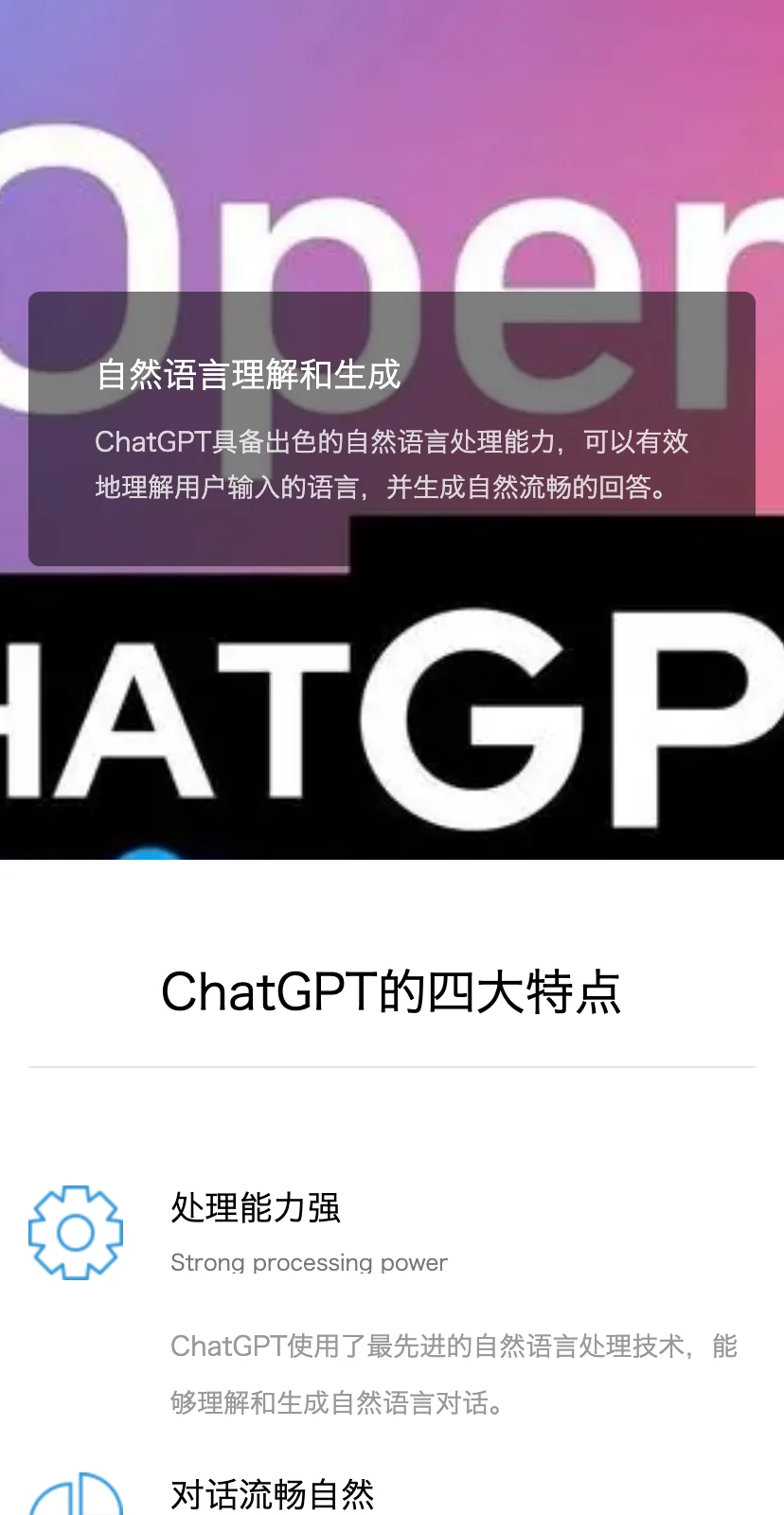 多语言支持Multilingual support ChatGPT支持多种语言,包括中文、英文、法语、西班牙语、德语、意大利语等。 应用场景广泛Wide range of applications ChatGPT适用于各种不同的应用场景,例如客服、教育、金融、医疗等多个领域。 自适应性强Adaptive ChatGPT不断学习用户的输入和反馈,持续优化自身能力,并提供更加准确、自然的回答。 ChatGPT能为你带来什么? ChatGPT是具备强大自然语言处理能力的聊天机器人,可以轻松应对各种场景,优化客户体验,提升服务效率。 客服场景 ChatGPT可以接管客服对话,自动解答客户咨询和问题,释放人力,节约成本,提升满意度。 教育场景 ChatGPT可以为学生提供智能辅导和答疑,帮助教师减轻工作负担,提高教育水平。 金融场景 ChatGPT可以提供精准智能投资建议和客户服务,优化金融机构的运营效率和客户体验。 医疗场景 ChatGPT可以进行病情咨询和诊断,避免医生答疑压力过大,提高医疗服务水平。 ChatGPT是一款具备强大自然语言处理能力的聊天机器人,可以根据用户的输入和反馈生成自然流畅的回答,并适应于多种不同领域和行业,例如客服、教育、金融、医疗等。它不仅支持多种语言,包括中文、英文、法语、西班牙语、德语、意大利语等,而且拥有多种特点。首先,它具备处理能力强大的特点,使用了最先进的自然语言处理技术,能够理解和生成自然语言对话。其次,它具有多语言支持的特点,可以适应不同语言环境。再次,它具备应用场景广泛的特点,能够适应各种不同的应用场景,并带来巨大的价值。最后,它具备自适应性强的特点,不断学习用户的输入和反馈,提供更加准确、自然的回答。ChatGPT可以应用于各种场景,例如客服、教育、金融、医疗等,可以轻松应对各种场景,优化客户体验,提升服务效率。
