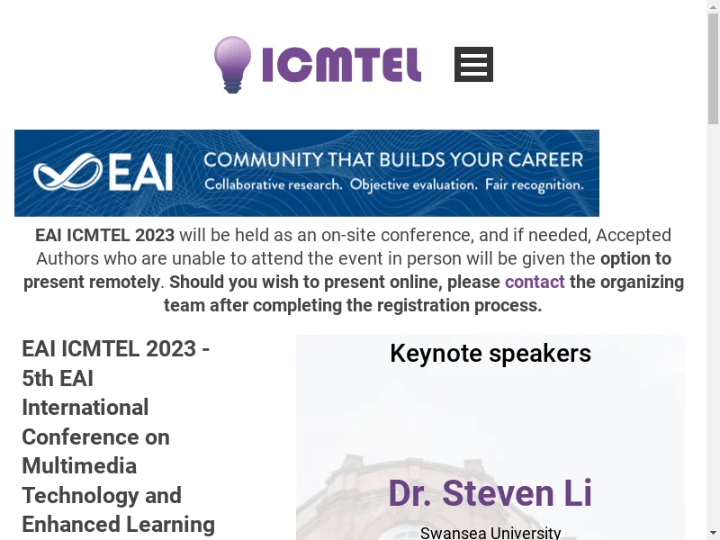 ICMTEL是一个国际性的多媒体技术与增强学习领域的会议组织机构。它定期召开国际会议,旨在提供一个交流平台,以促进多媒体技术在教育领域的应用,以及为增强学习提供更多的选择。 该网站是ICMTEL组织多年以来举办的第5届大会的官方网站,它包含了会议的详细信息,如会议日期,地点,主题,议程等内容。此外,它还提供了注册参会方式和投稿论文的指导和要求。 在ICMTEL 2023大会中,与会者将有机会与来自全球各地的学者、工程师和研究人员交流和分享他们对于多媒体技术和在线学习的最新研究进展。大会将聚焦于诸如虚拟现实、人工智能、教育技术和增强学习等重要领域。 ICMTEL的目标是通过会议交流,为多媒体技术和增强学习领域的专家提供一个平台,让他们探讨当前遇到的问题,并找到解决方法。它的宗旨是通过与会者之间的讨论和合作,促进教育领域的发展。
