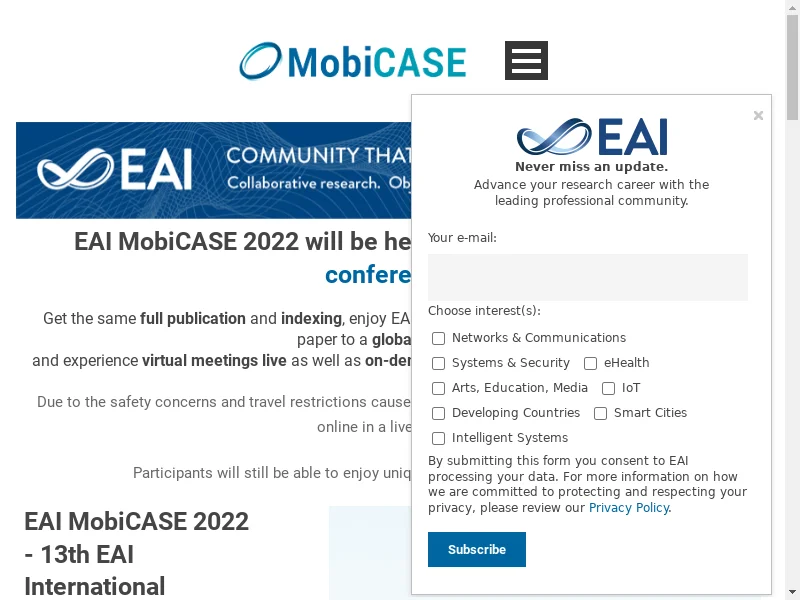 据,这是一个关于移动计算、应用和服务领域的国际会议网站。EAI MobiCASE 2022是第13届该会议,其主题涵盖了移动计算、移动应用、移动云计算、移动安全、物联网和移动人机界面等方面。该网站可以提供与MobiCASE相关的信息,包括论文提交、重要日期、会议议程、注册费用以及会场地点等。同时,该网站还提供会议日程表,包括演讲者的详细信息,以便参会者可以更好地了解会议的细节和主题。 该网站还有一个重要的特点是它是一个由欧洲联合学术专业协会主办的会议,因此,该会议有着较高质量的论文和演讲者。同时,参与该会议还可以扩展和分享您的知识和经验,以及与其他与会者建立联系和网络。对于移动技术和应用的专业人员、学术研究者以及学生来说,这个网站提供了一个很好的平台,使他们能够参与到一个高水平的国际会议中,从而能够了解最前沿的移动计算、应用和服务的趋势和发展。总之,该网站为移动计算、应用和服务领域的从业者和研究者提供了一个很好的平台,以参与到高质量的国际会议中,从而推动这个领域的发展和创新。