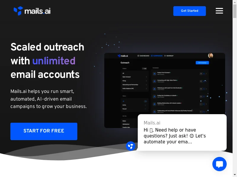 kground-color: rgba(255, 255, 255, 0);}Mails.ai是一个电子邮件自动化工具,用于最大化你的冷邮件营销。它的主要目的是帮助你节省时间和精力,自动化电子邮件营销,提高电子邮件回复率,并帮助你建立更强的业务联系。Mails.ai的主要功能包括:自定义模板、自动跟进、分段收件箱、分析及统计,以及可定制的电子邮件列表。此外,该网站提供了一个易于使用、直观的用户界面,使你可以轻松地管理你的营销活动。如果你是一家小型企业或创业公司,Mails.ai可以帮助你以有吸引力、高效和量身定做的方式来管理和推广你的业务。如果你需要一个简单但灵活的电子邮件自动化工具来提高你的电子邮件营销效果,那么Mails.ai就是你不容错过的选择。