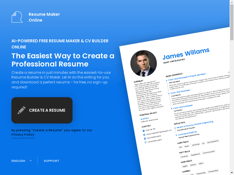 me in just minutes. ResumeMaker.Online是一个免费的在线求职简历建立工具。这个网站是由AI技术提供支持的,可帮助用户在几分钟内轻松地创建专业的简历。它具有用户友好的界面和一系列强大的功能,无论您处于职业生涯的哪个阶段,都能帮助您打造完美的简历。 在这里,用户不需要注册即可使用,只需填写个人信息、工作经历、教育背景、技能和语言等信息,系统就会根据用户提供的信息自动生成一份完美的简历。此外,该网站还提供了多种语言版本,如英语、西班牙语、法语、意大利语和瑞典语等。 无论是初入职场还是已经有多年工作经验,ResumeMaker.Online都能为您提供优质的简历制作服务。该网站的最终目的是帮助用户创造一份最具吸引力和实用性的简历,以便更好地展示您的能力和经验,提高您获得面试的机会。
