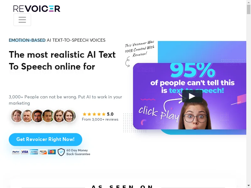 llo,这个网站是Revoicer,它是一个基于情绪生成AI语音的在线平台。它可以将文字转换为自然而然的语音,同时可以定制不同情感、年龄和性别的声音,可以应用于语音交互、文化娱乐、教育培训、智能客服等多个领域。这个平台由全球领先的人工智能语音技术公司Voice.ai打造,Revoicer独特的优势在于AI声音技术,可实现自然流畅的语音转换,达到近乎真人的效果,使用户获得更佳的体验。同时,Revoicer也提供了简单易用的API,方便开发者将这些声音应用于自己的项目中。Revoicer的使用非常简单,只需输入文字,选择声音类型后点击播放即可听到自然流畅的语音,使用方便,效果非常好。Revoicer正在不断完善其技术和服务,助力人们更轻松地沟通与交流。