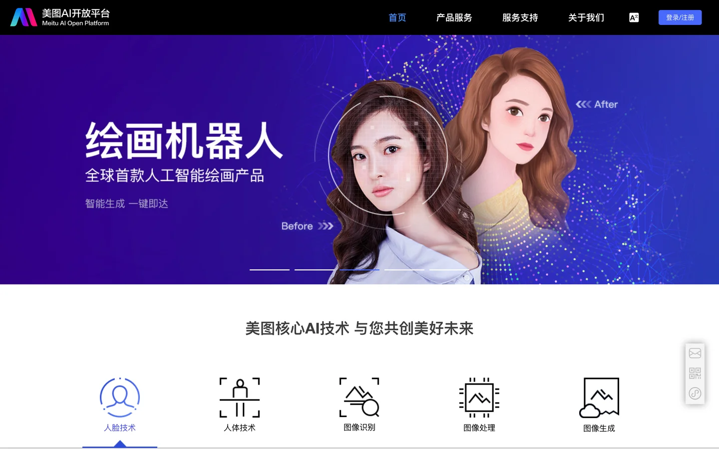 这个网站是美图公司的AI技术应用官网,主要展示了他们最新开发的多个AI技术,包括人像生成、人像合成、人脸动态表情、摄影辅助等多个方面。通过这些AI技术,用户可以将自己的照片进行改良、美化和修复,制作出更加精美的照片和视频。网站支持在线使用AI技术进行照片处理,并提供多种工具和效果供选用,是一个非常实用和创新的网站。