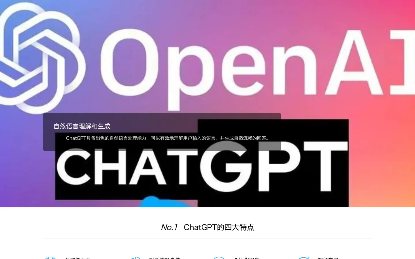 多语言支持Multilingual support ChatGPT支持多种语言,包括中文、英文、法语、西班牙语、德语、意大利语等。 应用场景广泛Wide range of applications ChatGPT适用于各种不同的应用场景,例如客服、教育、金融、医疗等多个领域。 自适应性强Adaptive ChatGPT不断学习用户的输入和反馈,持续优化自身能力,并提供更加准确、自然的回答。 ChatGPT能为你带来什么? ChatGPT是具备强大自然语言处理能力的聊天机器人,可以轻松应对各种场景,优化客户体验,提升服务效率。 客服场景 ChatGPT可以接管客服对话,自动解答客户咨询和问题,释放人力,节约成本,提升满意度。 教育场景 ChatGPT可以为学生提供智能辅导和答疑,帮助教师减轻工作负担,提高教育水平。 金融场景 ChatGPT可以提供精准智能投资建议和客户服务,优化金融机构的运营效率和客户体验。 医疗场景 ChatGPT可以进行病情咨询和诊断,避免医生答疑压力过大,提高医疗服务水平。 ChatGPT是一款具备强大自然语言处理能力的聊天机器人,可以根据用户的输入和反馈生成自然流畅的回答,并适应于多种不同领域和行业,例如客服、教育、金融、医疗等。它不仅支持多种语言,包括中文、英文、法语、西班牙语、德语、意大利语等,而且拥有多种特点。首先,它具备处理能力强大的特点,使用了最先进的自然语言处理技术,能够理解和生成自然语言对话。其次,它具有多语言支持的特点,可以适应不同语言环境。再次,它具备应用场景广泛的特点,能够适应各种不同的应用场景,并带来巨大的价值。最后,它具备自适应性强的特点,不断学习用户的输入和反馈,提供更加准确、自然的回答。ChatGPT可以应用于各种场景,例如客服、教育、金融、医疗等,可以轻松应对各种场景,优化客户体验,提升服务效率。