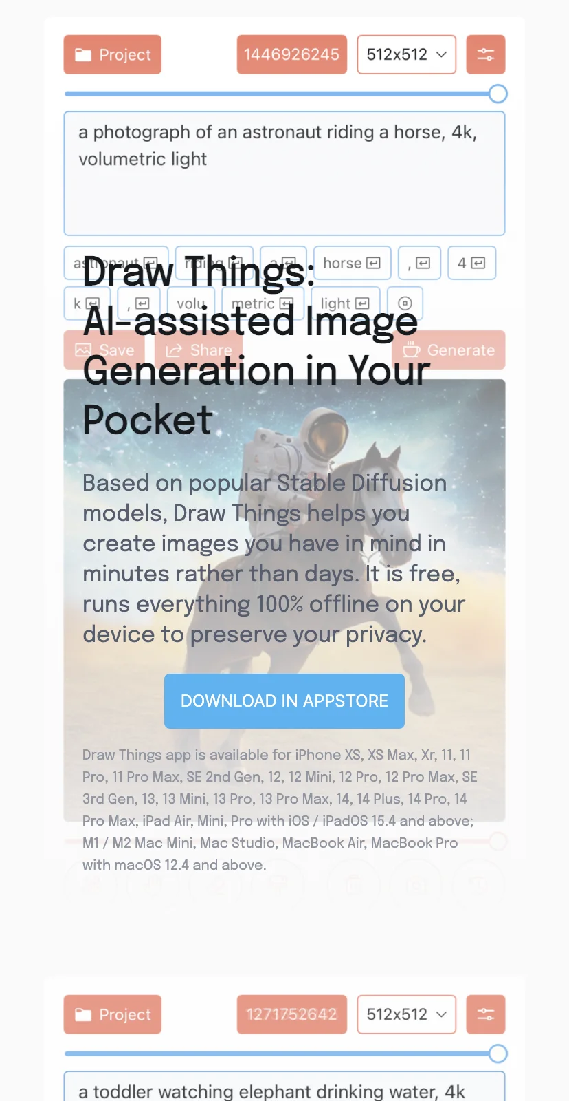 monly Available to the General Public Draw Things是一个能够辅助图像生成的AI应用,基于流行的稳定扩散模式,可以在几分钟内创建您想象中的图像,帮助您完成图片编辑工作。该应用免费,可以完全离线运行,确保您的隐私安全。您可以在AppStore上下载,也可以直接下载安装。该应用适用于iOS / iPadOS 15.4以上版本的设备,包括:iPhone XS、XS Max、Xr、11、11 Pro、11 Pro Max、SE 2nd Gen、12、12 Mini、12 Pro、12 Pro Max、SE 3rd Gen、13、13 Mini、13 Pro、13 Pro Max、14、14 Plus、14 Pro、14 Pro Max、iPad Air、Mini、Pro及 M1 / M2 Mac Mini、Mac Studio、MacBook Air、MacBook Pro等设备。 Draw Things具有完整的新兴图像生成编辑工作流程:修复遮罩、扩展图像、文本生成图像、文本引导图像生成、图像和提示编辑历史,同时还拥有所有专业稳定扩散技术的特点,具有不寻常的公共开放性。该应用的全部功能还包括:直接从相机拍摄或相册选取图片,支持各种图片格式,支持近千种常用语言和字符,支持多重困难程度的图像编辑,同时还能精确呈现您想要表达的图像风格、颜色、纹理和图案效果等等。实现您心中的艺术梦想,从Draw Things开始。
