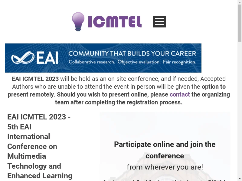ICMTEL是一个国际性的多媒体技术与增强学习领域的会议组织机构。它定期召开国际会议,旨在提供一个交流平台,以促进多媒体技术在教育领域的应用,以及为增强学习提供更多的选择。 该网站是ICMTEL组织多年以来举办的第5届大会的官方网站,它包含了会议的详细信息,如会议日期,地点,主题,议程等内容。此外,它还提供了注册参会方式和投稿论文的指导和要求。 在ICMTEL 2023大会中,与会者将有机会与来自全球各地的学者、工程师和研究人员交流和分享他们对于多媒体技术和在线学习的最新研究进展。大会将聚焦于诸如虚拟现实、人工智能、教育技术和增强学习等重要领域。 ICMTEL的目标是通过会议交流,为多媒体技术和增强学习领域的专家提供一个平台,让他们探讨当前遇到的问题,并找到解决方法。它的宗旨是通过与会者之间的讨论和合作,促进教育领域的发展。