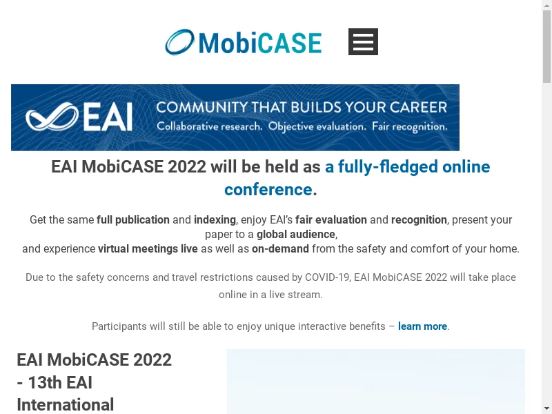 据,这是一个关于移动计算、应用和服务领域的国际会议网站。EAI MobiCASE 2022是第13届该会议,其主题涵盖了移动计算、移动应用、移动云计算、移动安全、物联网和移动人机界面等方面。该网站可以提供与MobiCASE相关的信息,包括论文提交、重要日期、会议议程、注册费用以及会场地点等。同时,该网站还提供会议日程表,包括演讲者的详细信息,以便参会者可以更好地了解会议的细节和主题。 该网站还有一个重要的特点是它是一个由欧洲联合学术专业协会主办的会议,因此,该会议有着较高质量的论文和演讲者。同时,参与该会议还可以扩展和分享您的知识和经验,以及与其他与会者建立联系和网络。对于移动技术和应用的专业人员、学术研究者以及学生来说,这个网站提供了一个很好的平台,使他们能够参与到一个高水平的国际会议中,从而能够了解最前沿的移动计算、应用和服务的趋势和发展。总之,该网站为移动计算、应用和服务领域的从业者和研究者提供了一个很好的平台,以参与到高质量的国际会议中,从而推动这个领域的发展和创新。