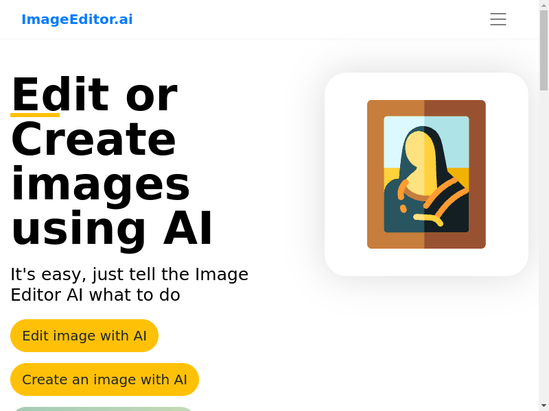 ImageEditor.ai是一款让人惊叹的在线图片制作和编辑工具。您可以使用这个网站制作和编辑图片,并通过人工智能来改善图片的质量。该网站的特点是通过使用AI技术,可以从无限数量的图像数据中学习,并生成具有高度真实感的图片。此外,使用该网站还可以实现自动抠图、改变图片的背景、对比度、颜色,增加特效等操作。 该网站非常容易使用,只需要将您要编辑的图片上传到网站中,选择您想使用的修图工具,然后AI就会自动完成后续的步骤。从业界的角度看,ImageEditor.ai开辟了一个新的图像编辑智能化的领域,在未来将会有更多的功能和操作被添加进这个平台。此外,该网站还提供不少于100种模板,可供您使用将图片转换成照片风格的图片。 总体而言,ImageEditor.ai是一款便捷、卓越和创新的图片处理网站,无需下载任何软件或安装任何应用程序,您都可以使用它的功能。并且该网站提供非常详细的教程和说明文档,让用户能够轻松、方便、快速地使用它的功能。不仅如此,它还是一个免费的在线工具,让用户可以轻松地制作和编辑图片,具有非常高的实用性和良好的用户体验。
