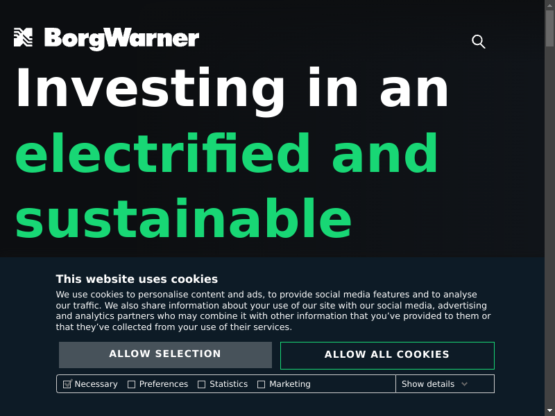 BorgWarner是一家全球领先的汽车零部件制造商,网站提供了该公司的各种业务和服务信息。该公司的主营业务包括发动机和变速器系统、动力管理、热管理、传动系统和高性能产品。网站的主页提供了BorgWarner的最新新闻、活动和产品信息,您可以通过导航栏了解该公司的不同业务领域和解决方案。网站的“关于我们”栏目介绍了该公司的历史、价值观、管理团队和全球分支机构,以及其社会责任感和可持续性计划。此外,网站还提供了职业生涯方面的信息,包括招聘信息和校园招聘计划,使用户可以了解该公司的工作机会和文化。BorgWarner的网站提供了一个全面而易于导航的平台,使客户、合作伙伴和求职者可以了解该公司的业务范围和竞争力,同时向公众展示其技术实力和贡献。
