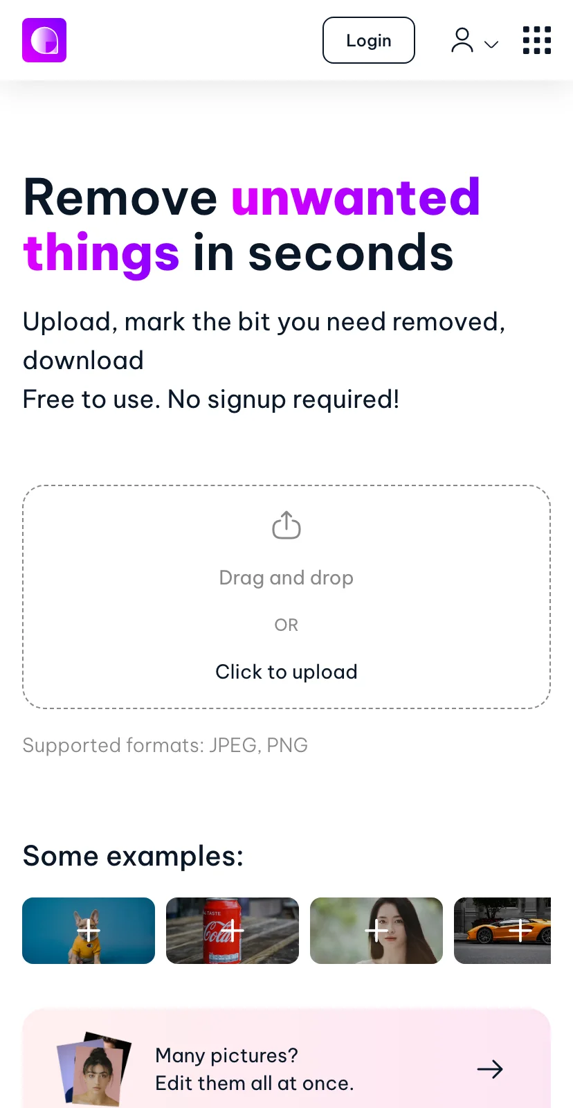 这是一个在线工具网站,名为Magic Eraser。通过这个网站,您可以使用各种工具来编辑和修改图片。Magic Eraser提供了一个简单易用的界面,以帮助用户快速轻松地完成各种图像编辑任务。 该网站提供了多种功能,包括背景去除、颜色调整、尺寸调整和滤镜效果等功能。其中,背景去除功能尤为强大,可帮助用户轻松地从图片中去除背景,从而制作出优美的图像。 Magic Eraser的优点还包括可以无需任何下载和安装即可使用,并支持多种文件格式,例如JPG、PNG、GIF等。此外,该网站界面简洁明了,用户可以通过简单的操作来实现高质量的图像编辑和修改。 总之,Magic Eraser是一款非常实用的在线图像编辑工具,适用于需要处理和修改图片的任何人,无需专业的技术和工具,也无需额外的费用。