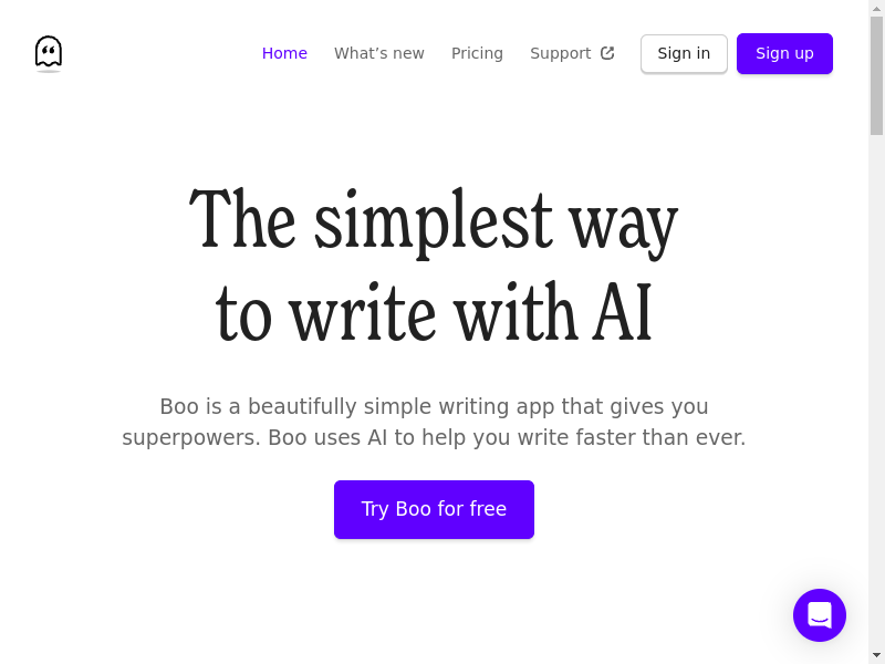 https://boo.ai 是一个提供人工智能助写服务的网站。这个网站拥有一个简洁美观的界面,通过人工智能技术帮助用户提高写作效率和质量。用户可以在该网站中输入文本,然后它会自动修正文本中的错误,改进语言表达,还可以检查语法错误和标点符号使用等。此外,该网站还有一个智能建议工具,可以根据用户输入的文字提出相关的写作建议,帮助用户更好地表达意思。除此之外,用户可以设置目标字数,boo.ai 会自动计算目前已经写出的字数甚至还能估算剩余所需的写作时间,这功能非常实用。总之,boo.ai 网站为用户提供了一个高效便捷的写作辅助工具,无论是工作、学习还是日常写作,都是非常优秀的帮手。