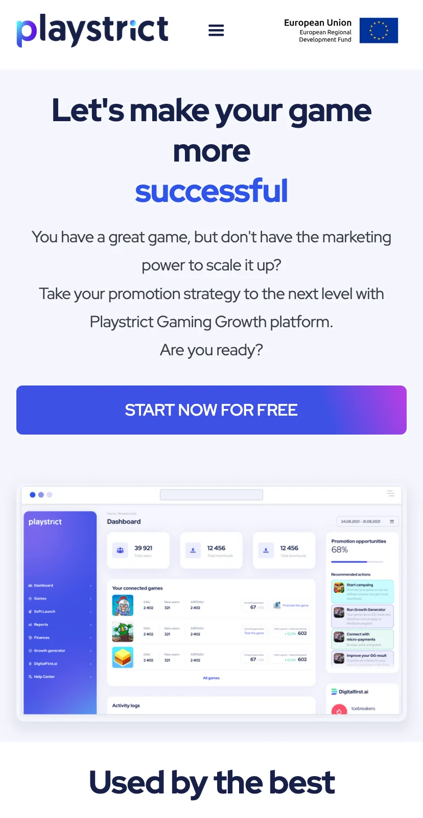 Playstrict是一个面向游戏开发者的移动游戏增长平台,旨在通过提供全面的营销、发现和推广服务,帮助开发者增长和盈利。这个网站首页展示了他们的核心功能,如Game Checker、营销和运营、Soft Launch等等,并介绍了他们的广告网络和自助发布市场等服务。Playstrict的活动经理和数据分析帮助开发者为他们的游戏选择不同的用户获取策略,从而扩大游戏的规模和受众。此外,网站还提供了一系列常见问题的解答和客户评价,展示了他们的专业性和客户满意度。通过这个平台,游戏开发者可以把精力集中在游戏创作上,而让Playstrict的团队来解决推广和增长等问题。