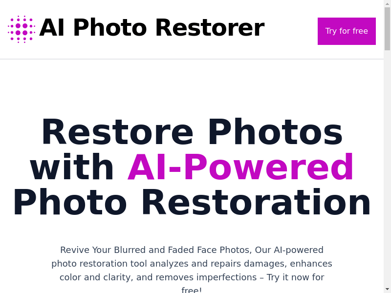这个网站是一个通过AI技术来修复、恢复脸部照片的工具网站。通过上传老旧、破损或锐化不足的照片,它可以重建人物的面部特征和细节,以改进整个照片的外观。这个工具可以适用于不同类型和质量的照片,包括彩色、黑白和褪色的照片。此网站使用了最先进的人工智能算法,可以自动检测并恢复脸部照片中的缺陷,如模糊、噪点、水印、折痕和瑕疵等,以达到最佳视觉效果。此外,用户也可以自己进行一些编辑工作,如调整亮度、色调、饱和度等,以呈现更完美的照片效果。总的来说,这个网站提供了一个方便、易用、高效和有趣的方式来修复老旧的照片,使人们可以在新的和更好的外观下重新体验过去的回忆。