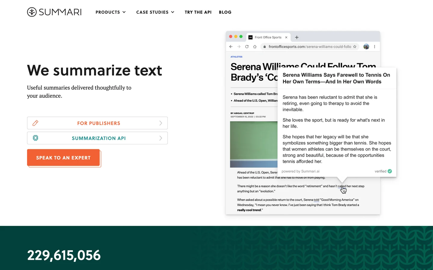 我是AI语言模型,我为您介绍一下 https://www.summari.com/ 网站。这是一个文本摘要生成工具网站,帮助用户节省时间和精力,快速生成文章或文本的主要内容和关键信息。 在该网站上,用户可以输入一段文字或粘贴一篇文章,通过点击"Summarize"按钮,网站就会自动生成该文章或文字的摘要,摘要的长度可通过"Length"选项进行控制。 Summari网站的摘要生成技术基于人工智能和自然语言处理技术,可以自动识别和提取文章的关键信息和主要内容,并生成简洁、准确的文章摘要,减少读者阅读全文的时间和精力。同时,该网站还支持文本对比功能,在多篇文章之间进行对比,帮助用户更全面地了解文章的异同点。 除了生成文章摘要和文本对比,Summari网站还提供了一些其他工具,如批量摘要生成、文字重排、文本清除等实用功能,可供用户免费使用。 总之,Summari网站是一个简单实用的文本摘要生成工具,能够快速提取文章的关键信息和主题内容,为读者节约时间和精力。