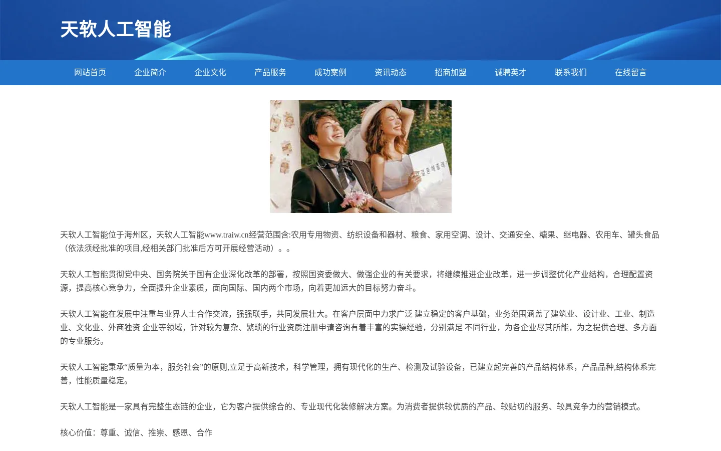 天软人工智能是一个位于海州区的网站,网址是http://www.traiw.cn。该网站提供企业简介、企业文化、产品服务、成功案例、资讯动态、招商加盟、诚聘英才、联系我们和在线留言等内容。天软人工智能的经营范围包括农用专用物资、纺织设备和器材、粮食、家用空调、设计、交通安全、糖果、继电器、农用车和罐头食品等。该公司致力于贯彻党中央、国务院关于国有企业深化改革的部署,并按照国资委的要求做大做强企业。天软人工智能强调与业界合作交流,建立稳定的客户基础,并为不同行业提供专业服务。企业秉承“质量为本,服务社会”的原则,拥有现代化的生产、检测及试验设备,提供现代化装修解决方案以及优质的产品、服务和营销模式。核心价值是尊重、诚信、推崇、感恩和合作,经营理念是客户、诚信、专业、团队和成功,服务理念是真诚、专业、精准、周全和可靠。企业愿景是成为受信任的创新性企业服务开放平台。网站还提供了友情链接,包括上海镐泽贸易有限公司、淄博云网电子商务有限公司、洱海网、骏一科技有限公司和云南乃敏建材销售等。